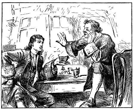 It is the custom that every Wednesday (which, as I have before observed, is their Sabbath) the king and queen, with the royal issue of both sexes dine together in the apartment of his majesty, to whom I was now become a great favorite; and, at these times, my little chair and table were placed at his left hand, before one of the salt-cellars. This prince took a pleasure in conversing with me, inquiring into the manners, religion, taws, government, and learning of Europe; wherein I gave him the best account I was able. His apprehension was so clear, and his judgment so exact, that he made very wise reflections and observations upon all I said. But I confess that after I had been a little too copious in talking of my own beloved country, of our trade, and wars by sea and land, of our schisms in religion, and parties in the state; the prejudices of his education prevailed so far that he could not forbear taking me up in his right hand, and, stroking me gently with the other, after a hearty fit of laughing, asked me, whether I was a whig or a tory? Then turning to his first minister, who waited behind him with a white staff, near as tall as the mainmast of the "Royal Sovereign,"[61] he observed how contemptible a thing was human grandeur, which could be mimicked by such diminutive insects as I: and yet, says he, I dare engage these creatures have their titles and distinctions of honor; they contrive little nests and burrows, that they call houses and cities; they make a figure in dress and equipage; they love, they fight, they dispute, they cheat, they betray. And thus he continued on, while my color came and went several times with indignation, to hear our noble country, the mistress of arts and arms, the scourge of France, the arbitress of Europe, the seat of virtue, piety, honor, and truth, the pride and envy of the world, so contemptuously treated.