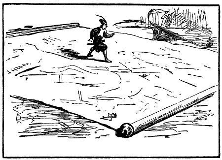 A fancy came into my head that I would entertain the king and queen with an English tune upon this instrument. But this appeared extremely difficult; for the spinet was nearly sixty feet long, each key being almost a foot wide, so that with my arms extended I could not reach to above five keys, and to press them down required a good smart stroke with my fist, which would be too great a labor, and to no purpose. The method I contrived was this: I prepared two round sticks, about the bigness of common cudgels; they were thicker at one end than the other, and I covered the thicker ends with a piece of mouse's skin, that by rapping on them I might neither damage the tops of the keys nor interrupt the sound. Before the spinet a bench was placed about four feet below the keys, and I was put upon the bench. I ran sideling upon it that way and this as fast as I could, banging the proper keys with my two sticks, and made a shift to play a jig to the great satisfaction of both their majesties; but it was the most violent exercise I ever underwent, and yet I could not strike above sixteen keys, nor consequently play the bass and treble together as other artists do, which was a great disadvantage to my performance.
