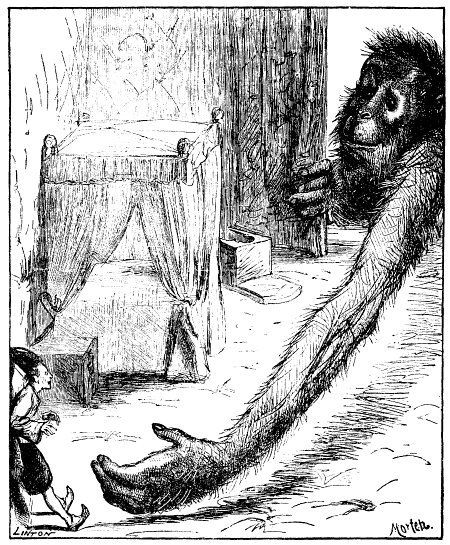 I retreated to the farther corner of my room or box; but the monkey looking in at every side, put me into such a fright that I wanted presence of mind to conceal myself under the bed, as I might easily have done. After some time spent in peeping, grinning, and chattering, he at last espied me, and reaching one of his paws in at the door, as a cat does when she plays with a mouse, although I often shifted place to avoid him, he at length seized the lappet of my coat (which, being made of that country silk, was very thick and strong), and dragged me out. He took me out in his right fore-foot, and held me as a nurse does a child, just as I have seen the same sort of creature do with a kitten in Europe: and, when I offered to struggle, he squeezed me so hard that I thought it more prudent to submit. I have good reason to believe that he took me for a young one of his own species, by his often stroking my face very gently with his other paw.